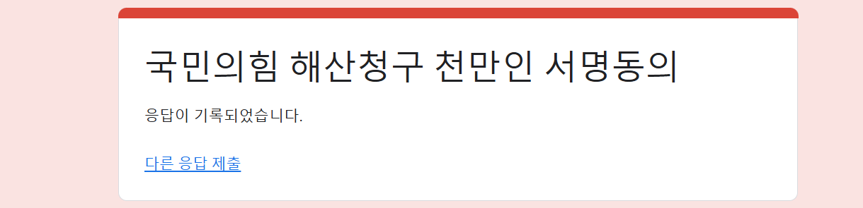 국민의힘 해산청구 천만인 서명동의는 구글설문지에서 확인할 수 있으며 또한 아래 국민의힘 해산청구 바로가기로 통해 바로 접속하여 진행할 수 있습니다. 국민의힘 해산청구 천만인 서명동의방법은 본인이름과, 거주지, 전화번호등 아주간략하게 진행 할 수 있으니 이점 참고하시어 국민의힘 해산청구 천만인 서명동의에 참여하시기 바랍니다. 국민의힘 해산청구 천만인 서명동의는 대한민국 주권자 누구나 동참할 수 있으며 또한 거부 할수 있습니다. 참여하고자 하시는 분들은 아래 링크를 통해 진행하시는것을 추천해드립니다.