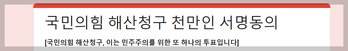 2025년 6월5일 국민의힘 해산청구 천만인 서명동의 운동이 구글설문지에서 진행되고 있습니다. 이번 국민의힘 해산청구 천만인 서명동의 12월3일 내란관련 민주주의 회복을 위해 잔존하는 위협에 단호히 맞서야 할 시점이며 국민의힘은 지난 시기 민주주의와 헌정질서를 훼손한 내란의 잔당으로, 그 존재 자체가 개혁과 진보의 걸림돌이 되고 있습니다. 법조·검경·언론·교육 개혁 등 주요 과제는 이 정당의 해산 없이는 실현되기 어렵다고 밝히며 국민의힘 해산청구 천만인 서명동의를 진행하고 있습니다.