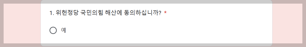2. 위헌정당 국민의힘 해산에 동의하십니까?의 질문에 "예'에 체크합니다.
