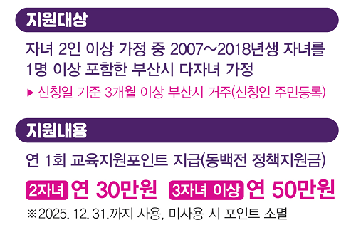 신청자격은 소득재한이 없으며 신청일기준 3개월이상 부산시 거주하며 2자녀 이상의 초등학생, 중학생, 고등학생 다자녀가정 (단, 자녀중 1명 이상 2007~2018년생 해당)으로 지원금액은 2자녀 : 30만원 / 3자녀 이상 : 50만원이 지급되며 신청기간은 2025.5.22 ~ 2025.12.12일 까지 이며 신청방법동백전 APP > 정책자금신청 > 다자녀교육지원포인트 선택 하며 됩니다. 19세이상의 성인자녀와 미취학자녀를 자녀수에 포함되오니 참고하시기 바랍니다.