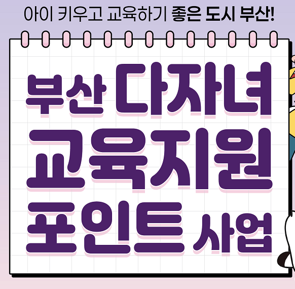 부산시교육청 김석준교육감은 다자녀 가정의 교육비 부담을 덜고 저출생 문제 대응을 위해 부산광역시와 손잡고 ‘2025년 부산 다자녀 교육지원포인트’ 사업을 추진한다고 밝혔습니다. 부산시 다자녀 교육지원포인트는 2025년 5월22일부터 12월12일 까지 신청할수 있으며 이번 부산시 다자녀 교육지원포인트 사업의 지원대상은 2자녀 이상 가정 중에 2007년부터 2018년생까지의 자녀 1명 이상의 초등학생,중학생,고등학생 학령기 자녀를 둔 부산 다자녀가정으로, 2자녀 가정에는 연 30만원, 3자녀 이상 가정에는 연 50만원을 포인트로 지급합니다.